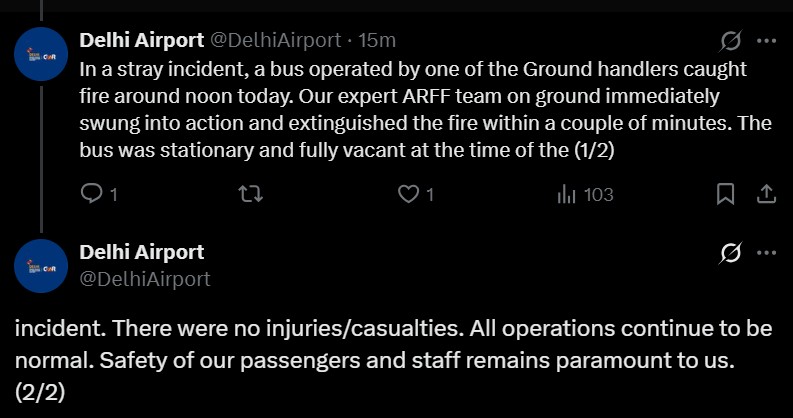 घटना के बाद दिल्ली एयरपोर्ट मैनेजमेंट ने बयान जारी किया है। उन्होंने बताया- दोपहर करीब 12 बजे एक ग्राउंड हैंडलिंग कंपनी की बस में अचानक आग लग गई।