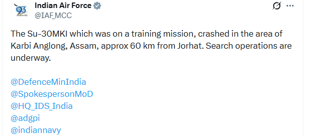 नई दिल्ली: असम के कार्बी आंगलोंग इलाके में ट्रेनिंग के दौरान रडार से गायब हुआ भारतीय वायु सेना का सुखोई Su‑30MKI फाइटर जेट क्रैश हो गया है। हादसे में दोनों पायलट स्क्वाड्रन लीडर अनुज और फ्लाइट लेफ्टिनेंट पूर्वेश दुरागकर की भी मौत हो गई है।