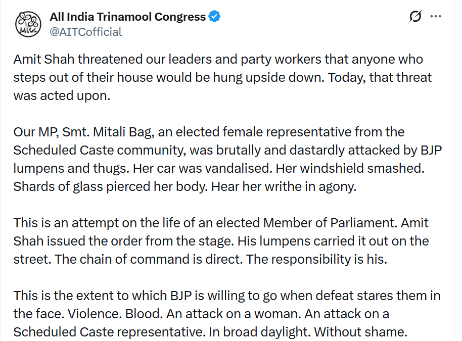 TMC का आरोप है कि भाजपा समर्थकों ने गोगहाट में सांसद की गाड़ी पर ईंट-पत्थर और लाठियों से हमला किया। TMC ने अपने ट्वीट में कहा- गृह मंत्री अमित शाह ने धमकी दी थी कि जो भी घर से बाहर निकलेगा, उसे उल्टा लटका दिया जाएगा। उसी के बाद यह हमला हुआ।