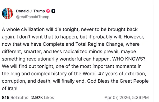 तेल अवीव/तेहरान/वॉशिंगटन डीसी: अमेरिका राष्ट्रपति डोनाल्ड ट्रम्प ने आज रात ईरान की पूरी सभ्यता खत्म करने की धमकी दी है। उन्होंने कहा- आज रात एक पूरी सभ्यता खत्म हो जाएगी, जिसे फिर कभी वापस नहीं लाया जा सकेगा।