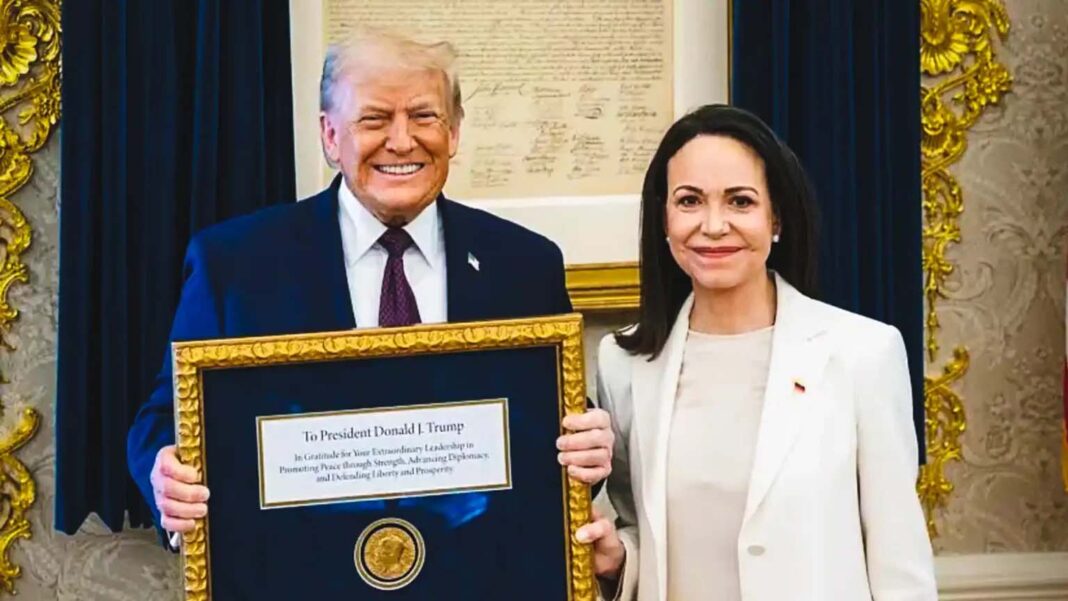 मारिया ने ट्रम्प को अपना नोबेल शांति पुरस्कार दिया। इस पर लिखा था कि ट्रम्प को वेनेजुएला के लोगों की तरफ से यह भेंट किया जा रहा है। ट्रम्प ने वेनेजुएला की आजादी के लिए जो किया उसे वेनेजुएला के लोग कभी नहीं भूलेंगे।