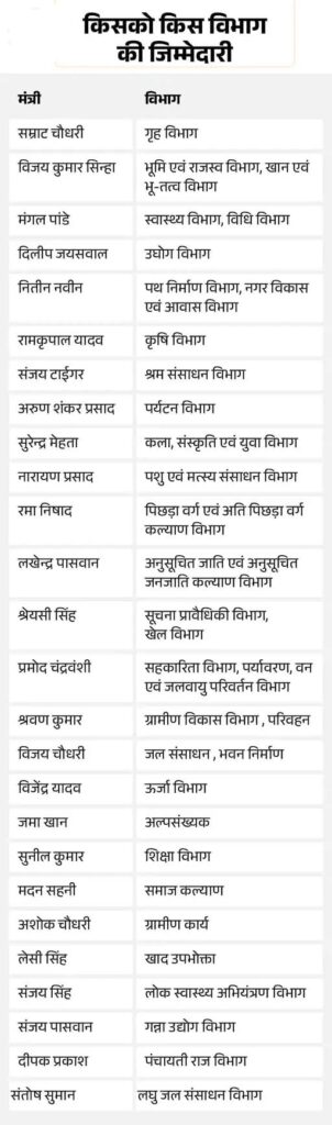 BJP ने वित्त विभाग JDU को दिया है। बिजेंद्र यादव ऊर्जा के साथ वित्त विभाग का जिम्मा भी देंखेंगे। इसके साथ ही मंगल पांडे को फिर से स्वास्थ्य विभाग का जिम्मा सौंपा है।