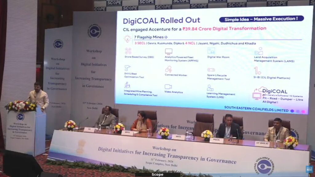 बिलासपुर (BCC NEWS 24): केन्द्रीय सतर्कता आयोग द्वारा 11 फरवरी 2026 को नई दिल्ली स्थित स्कोप कन्वेंशन सेंटर में “डिजिटल इनिशिएटिव्स फॉर इंक्रीजिंग ट्रांसपेरेंसी इन गवर्नेंस” विषय पर आयोजित राष्ट्रीय कार्यशाला में साउथ ईस्टर्न कोलफील्ड्स लिमिटेड (SECL) की डिजिटल ट्रांसफॉर्मेशन पहल ‘डिजीकोल (DigiCOAL)’ को सार्वजनिक उपक्रमों में पारदर्शिता, दक्षता और जवाबदेही बढ़ाने वाली एक आदर्श डिजिटल पहल के रूप में प्रस्तुत किया गया।