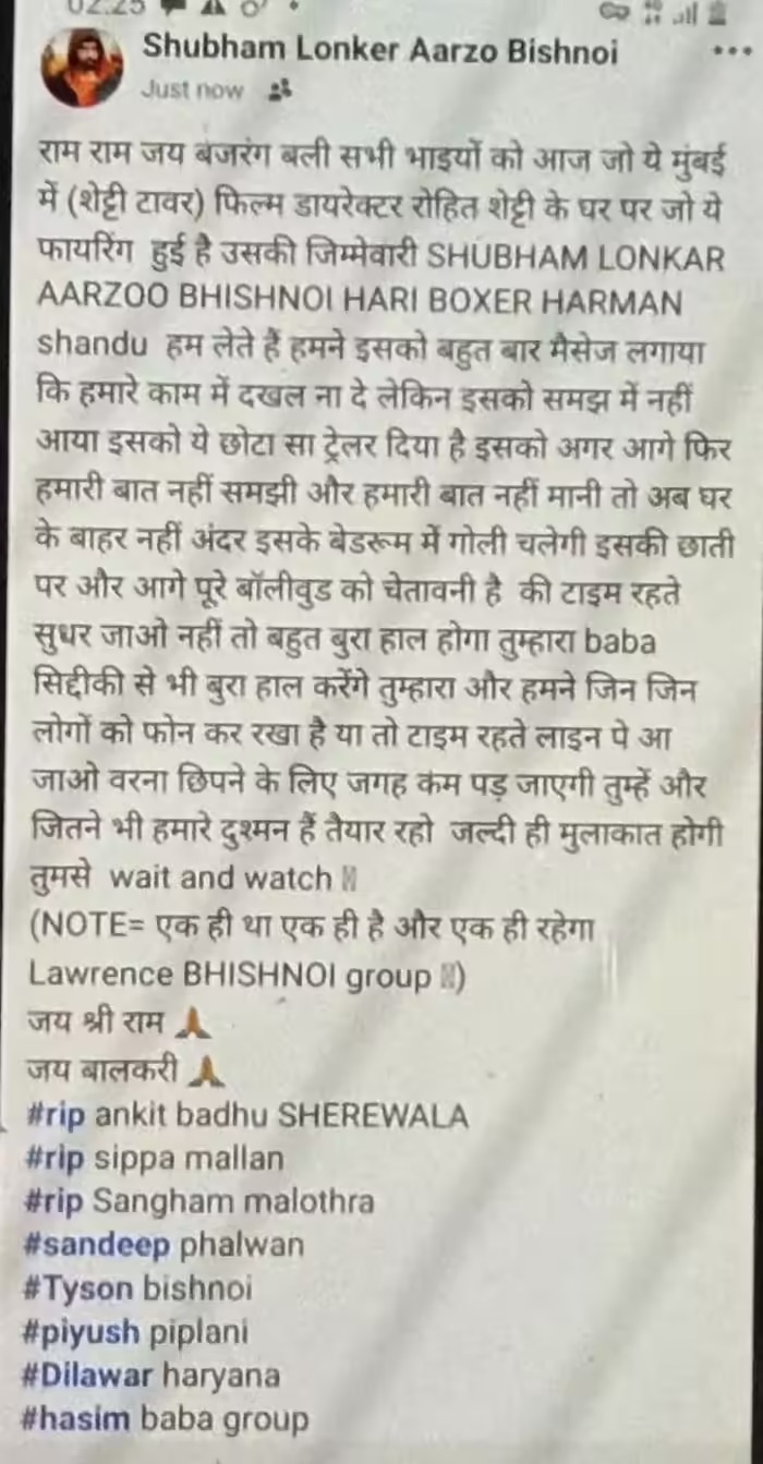 इस पोस्ट में लिखा गया है, “सभी भाइयों को आज जो ये मुंबई में (शेट्टी टावर) फिल्म डायरेक्टर रोहित शेट्टी के घर पर फायरिंग हुई है, उसकी जिम्मेदारी शुभम लोनकर, आरजू बिश्नोई, हरि बॉक्सर, हरमन संधू हम लेते हैं। हमने इसको बहुत बार मैसेज लगाया कि हमारे काम में दखल ना दे, लेकिन इसको समझ में नहीं आया। इसको ये छोटा सा ट्रेलर दिया है। अगर इसने आगे फिर हमारी बात नहीं समझी और हमारी बात नहीं मानी, तो अब घर के बाहर नहीं, अंदर इसके बेडरूम में गोली चलेगी, इसकी छाती पर।”