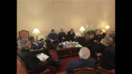 अमेरिका के साथ सीजफायर वार्ता से पहले ईरानी डेलिगेशन आपस में बात करते हुए।