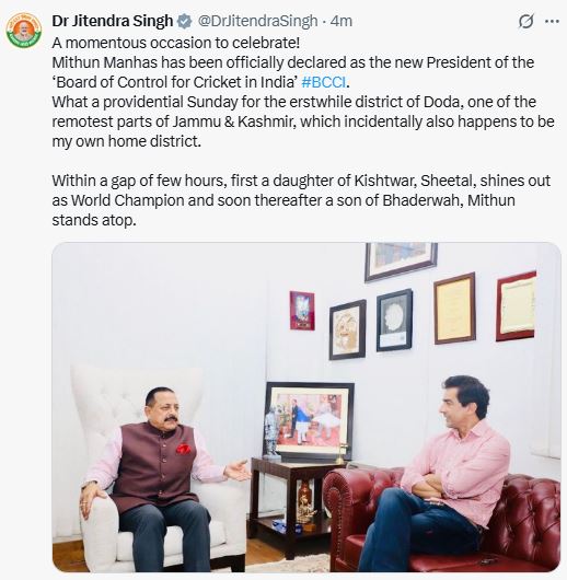 केंद्रीय मंत्री जितेंद्र सिंह ने X पर पोस्ट कर मिथुन मन्हास को बधाई दी। उन्होंने लिखा- मिथुन मन्हास आधिकारिक रूप से BCCI के अध्यक्ष बन गए हैं।