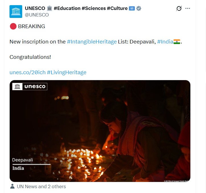 पीएम नरेंद्र मोदी ने X पर बधाई देते हुए लिखा, ‘भारत और दुनियाभर के लोग उत्साहित हैं। हमारे लिए दिवाली, संस्कृति और प्रकृति से जुड़ी है। यह हमारी सभ्यता की आत्मा है। यह ज्ञान और धर्म का प्रतीक है। दीपावली को यूनेस्को की अमूर्त विरासत सूची में शामिल किए जाने से इस त्योहार की वैश्विक लोकप्रियता में और भी वृद्धि होगी। प्रभु श्री राम के आदर्श हमें शाश्वत रूप से मार्गदर्शन करते रहें।