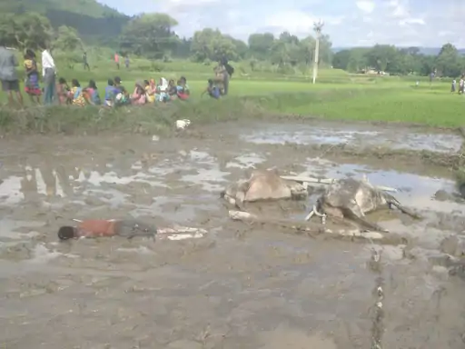 जानकारी के मुताबिक, ग्राम जजगा ऊपरपारा का रहने वाला युवा किसान मंजू खलखो (28 वर्ष) बुधवार को धान का रोपा लगाने के लिए खेत तैयार कर रहा था। एक जोड़ी बैलों के साथ वह खेत में पाटा (कीचड़नुमा खेत का समतलीकरण) मार ही रहा था कि अचानक ऊपर से गुजरा 11 केवी का तार टूटकर वहां आ गिरा। इसकी चपेट में आकर किसान और उसके दोनों बैलों की मौके पर ही मौत हो गई। वहीं छोटा भाई राजकुमार खलखो घटनास्थल से थोड़ी दूर था, जिसके कारण वो बाल-बाल बच गया।