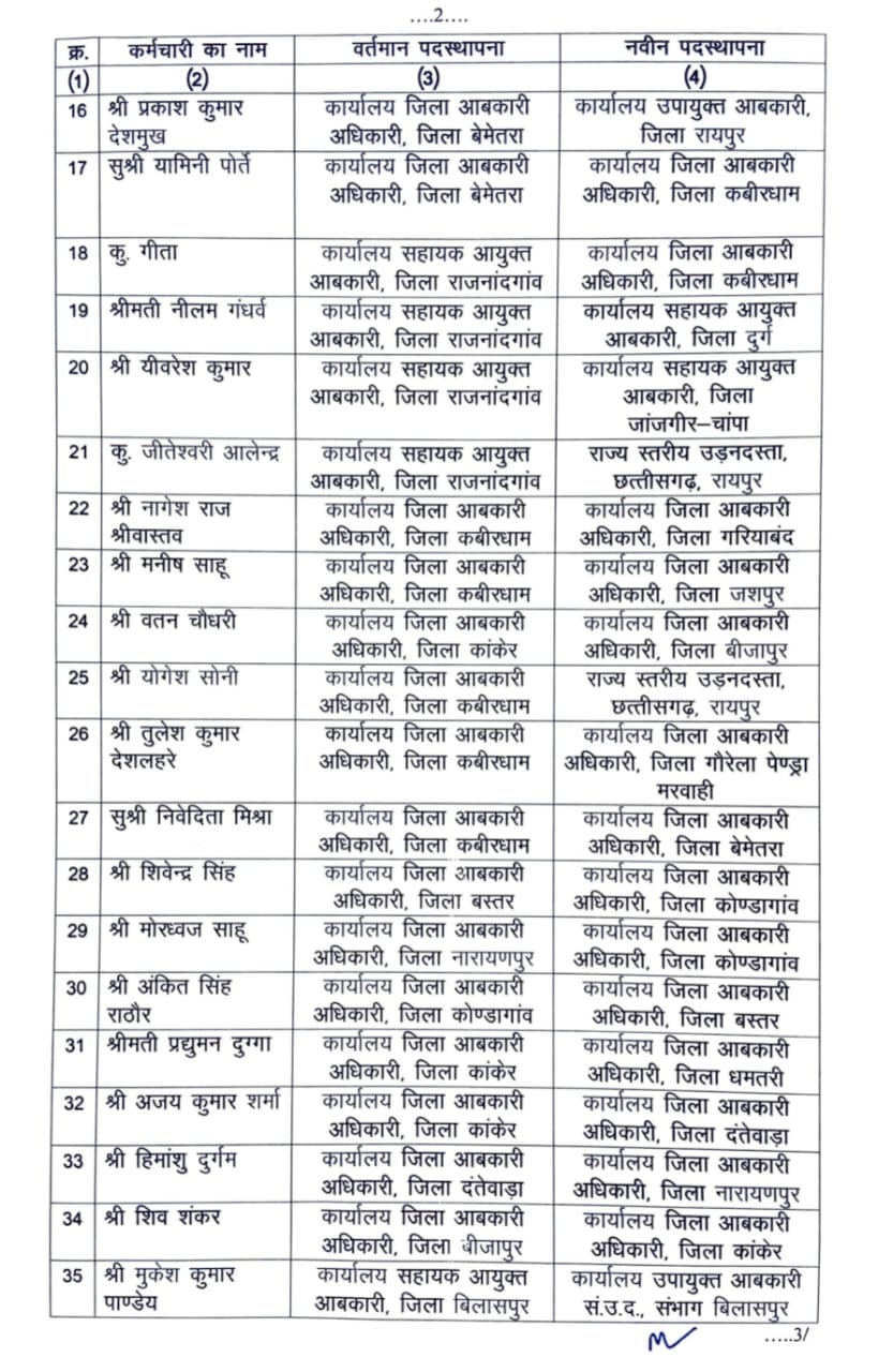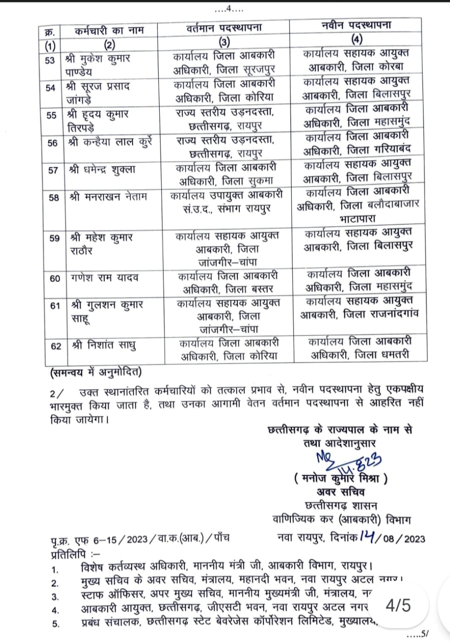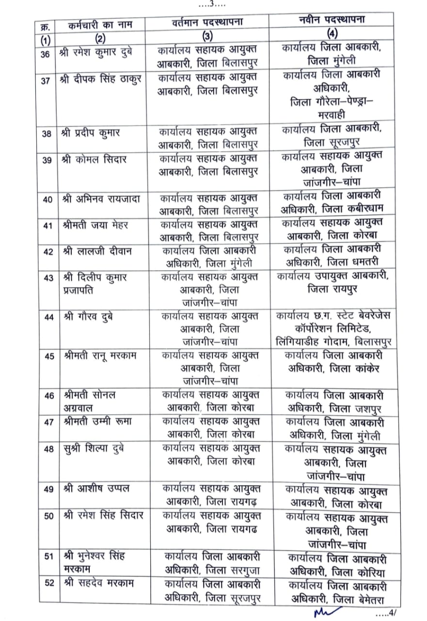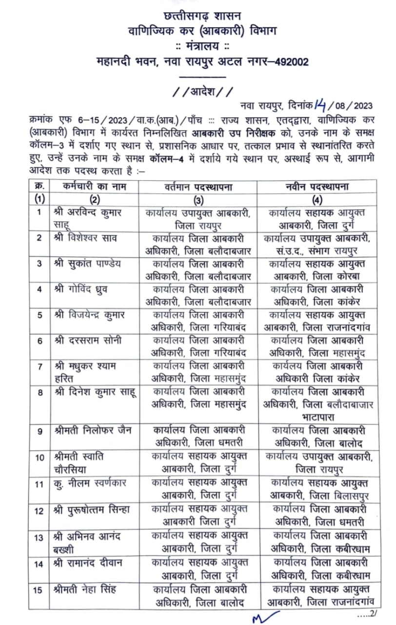 CG: आबकारी विभाग की ट्रांसफर लिस्ट जारी…अरविंद कुमार दुर्ग, विशेश्वर साव का रायपुर हुआ तबादला, यहां देखें पूरी लिस्ट