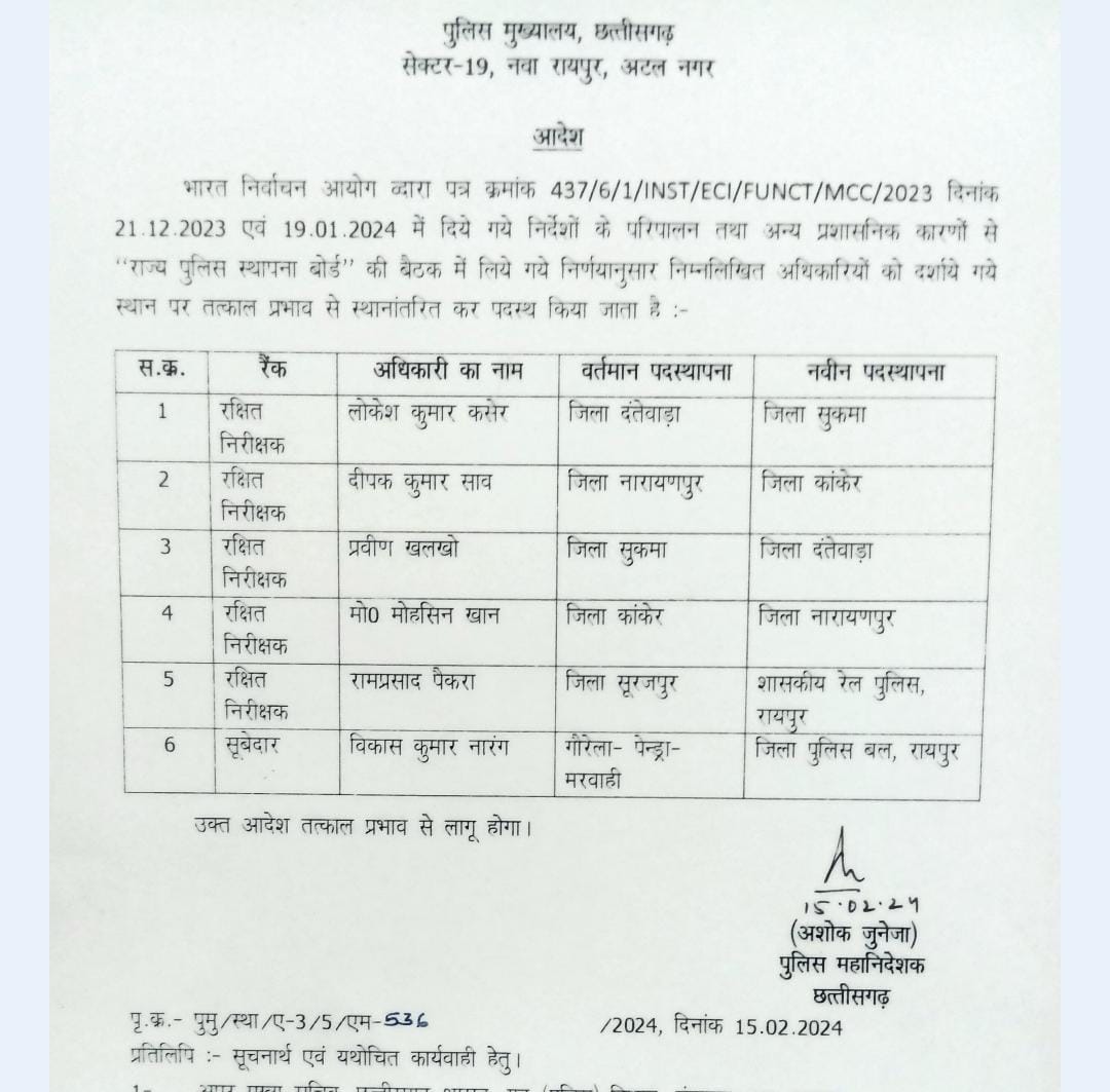 रायपुर: छत्तीसगढ़ में बड़े पैमाने पर इंस्पेक्टर और सब इंस्पेक्टरों के तबादले किए गए हैं। 12 जिले के 25 इंस्पेक्टर और 137 सब इंस्पेक्टरों का ट्रांसफर किया गया है। इसके अलावा पुलिस के कई विभागों में पदस्थ पुलिसकर्मियों का ट्रांसफर किया गया है।