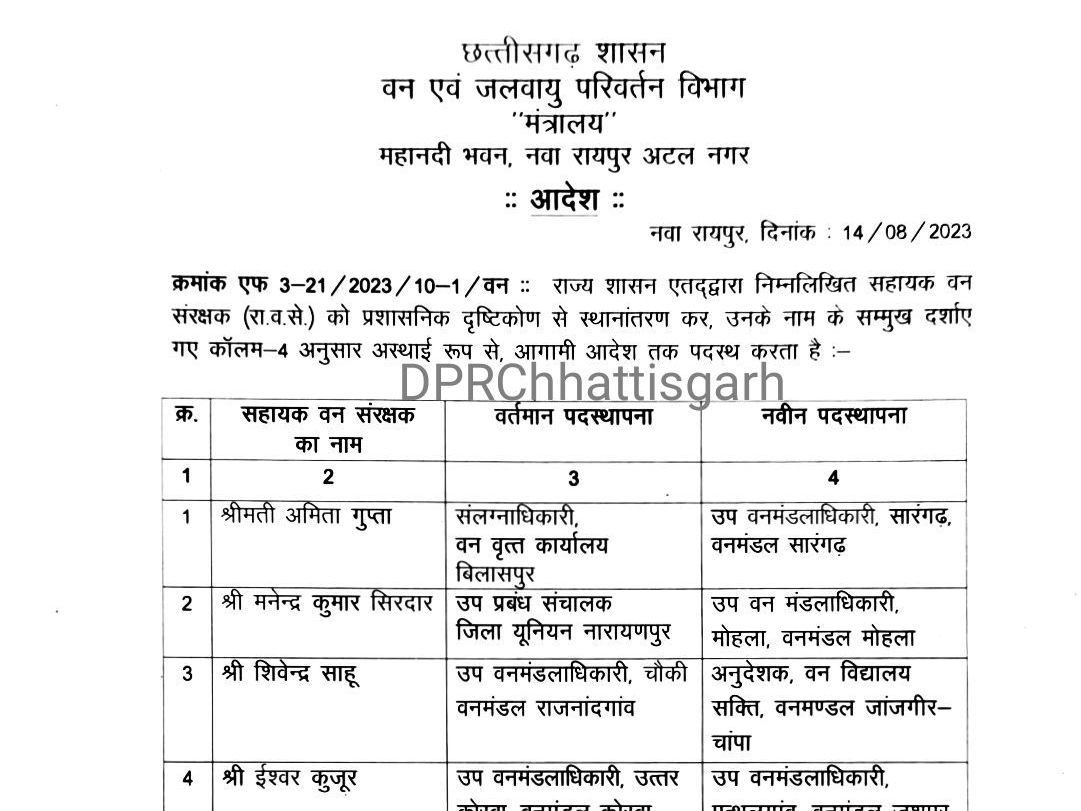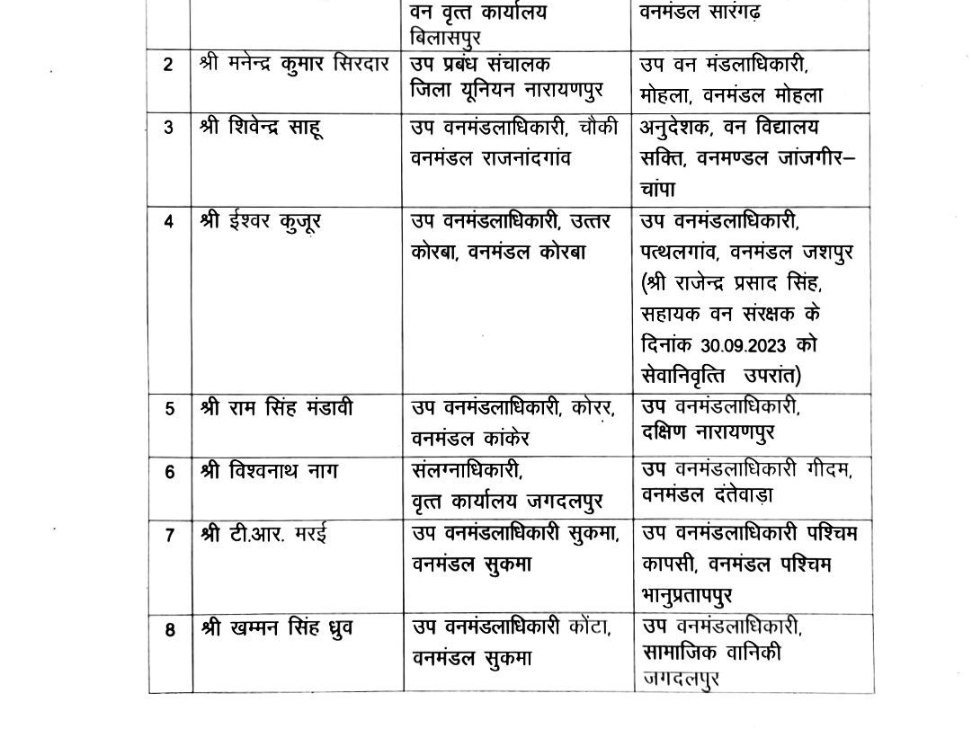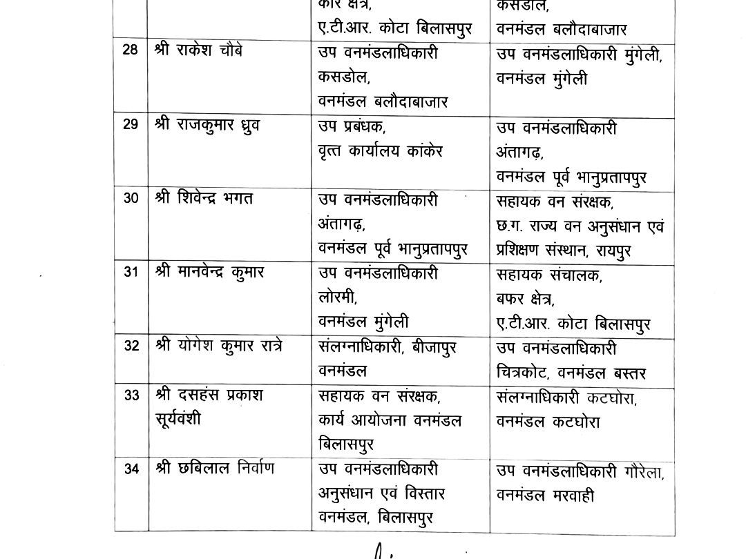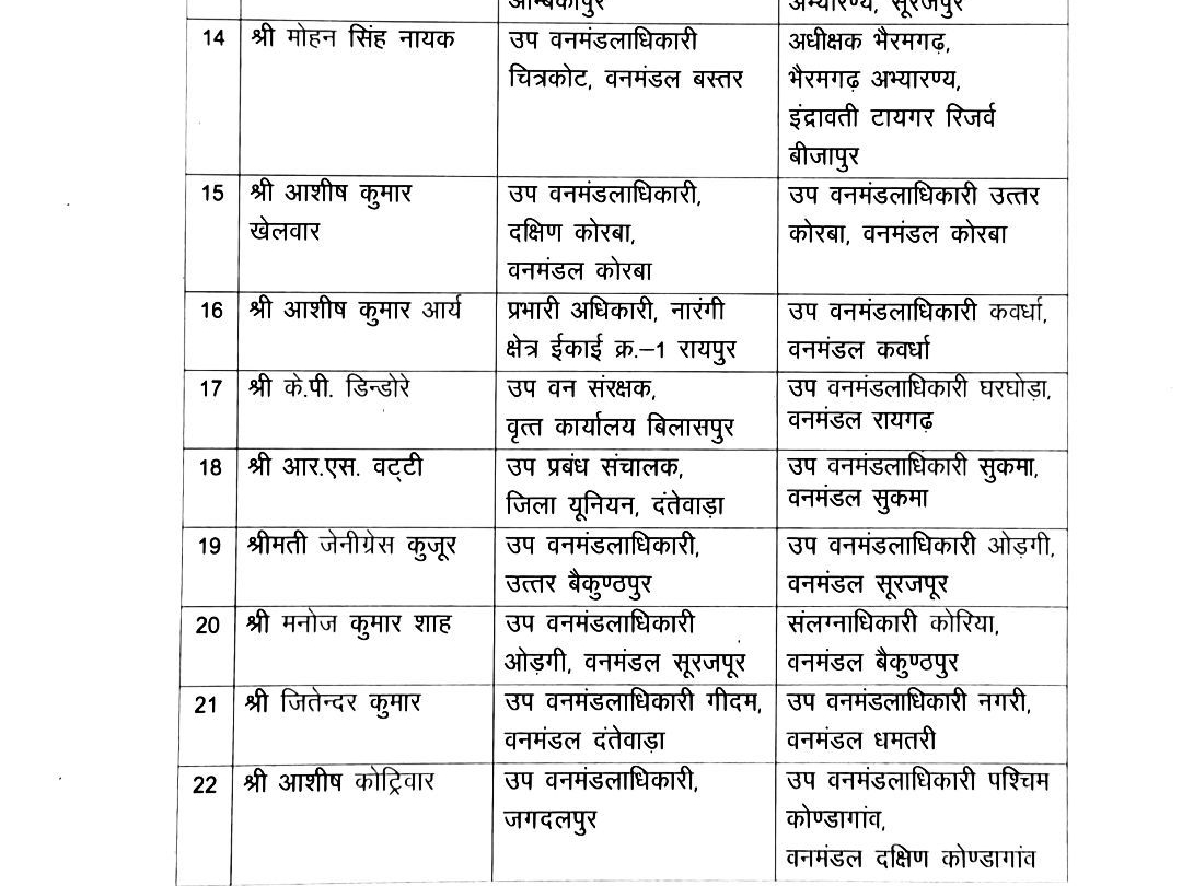 जारी आदेश के मुताबिक, नवीन निराला को उप वनमंडलाधिकारी अंबिकापुर बनाया गया है। नवीन इससे पहले पेंड्र वन मंडल में पदस्थ थे। इसके अलावा अजय कावरे को कोंटा वन मंडल का उप वनमंडलाधिकारी बनाया गया है।