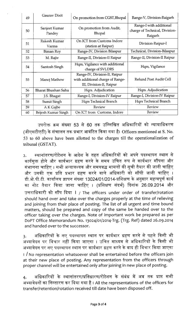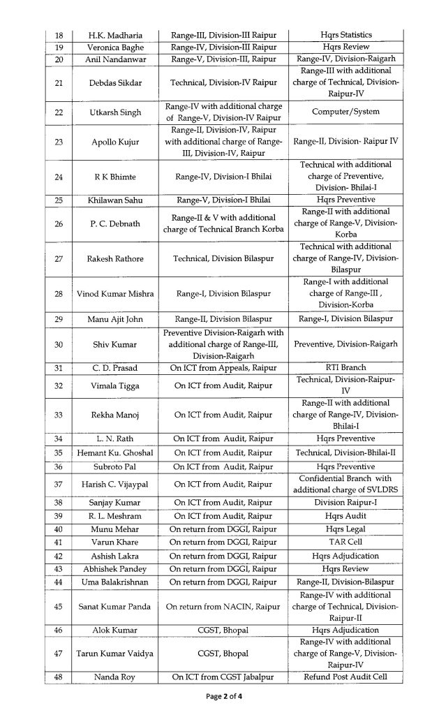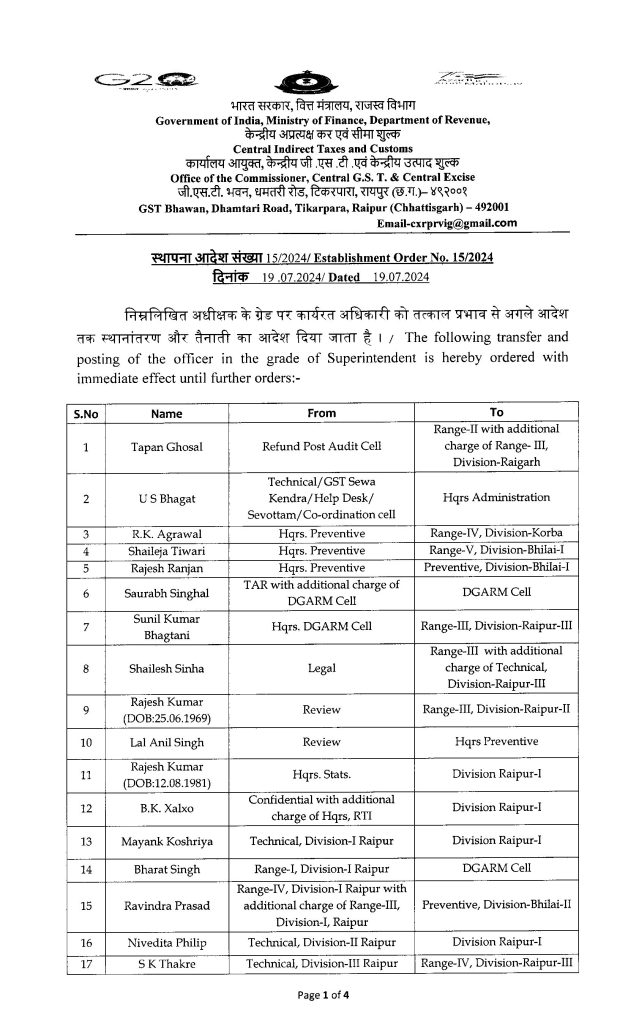छत्तीसगढ़ : सेंट्रल GST विभाग में बड़े पैमाने पर ट्रांसफर, 60 सुपरिटेंडेंट और 67 इंस्पेक्टर अफसरों को नवीन पदस्थापना दी गई, देखें आदेश