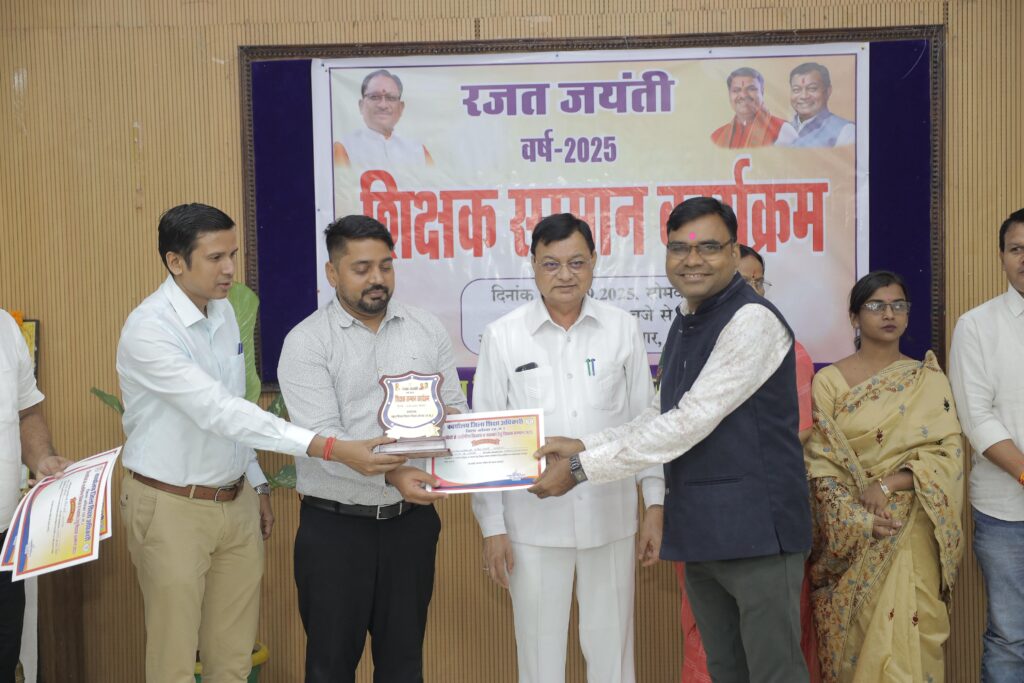 अनेक स्थानों में नए शाला भवन के निर्माण की स्वीकृति दी गई है एवं मेधावी छात्रों को निःशुल्क नीट जेईई की तैयारी भी डीएमएफ से की गई है। महापौर श्रीमती राजपूत , जिला पंचायत अध्यक्ष डॉ पवन सिंह सहित अन्य अतिथियों ने भी कार्यक्रम में सम्मानित शिक्षकों को बधाई दी। साथ ही मानव जीवन  में शिक्षकों की भूमिका की जानकारी देते हुए उनके योगदान की सराहना की। कार्यक्रम में मंत्री श्री देवांगन सहित अन्य अतिथियों द्वारा शिक्षा क्षेत्र में किए गए विशिष्ट कार्यो हेतु सम्मानित शिक्षकों को प्रशस्ति पत्र भेंटकर सम्मानित किया  गया। सम्मान के क्रम में राज्यपाल द्वारा सम्मानित हुए शिक्षक डॉ फरहाना अली, डॉ सुशील तिवारी, श्री शिवराज शर्मा, डॉ धरम लहरे, डॉ गीता देव हिमधर, डॉ जगन्नाथ हिमधर, श्री कामता जायसवाल, श्री राकेश टण्डन,  श्री गौरव शर्मा, श्री वीरभर्द सिंह पैंकरा, श्री नोहर चन्द्रा, श्री गोकुल प्रसाद मार्बल, श्रीमती वसुंधरा कुर्रे, श्री भूपेंद्र सिंह राठौर, श्रीमती मधुलिका दुबे, श्रीमती प्रिया दुबे, श्री सर्वेश सोनी,  श्री मुकुंद केशव उपाध्याय, श्रीमती  कौशिल्या खुराना एवं  श्री जितेंद्र कुमार साहू शील्ड व प्रमाण पत्र भेंटकर सम्मानित किया गया।