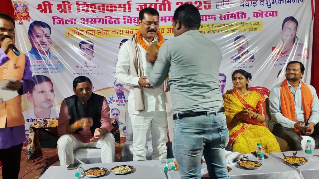 इस कार्यक्रम की अध्यक्षता भाजपा जिला अध्यक्ष श्री गोपाल मोदी द्वारा किया गया उन्होंने अपने अध्यक्षिय उद्बोधन में उपस्थित जनों को विश्वकर्मा जयंती की बधाई देते हुए कहा कि भगवान विश्वकर्मा द्वारा इस सृष्टि का निर्माण किया गया है जिसमे पेड़ पौधे नदी नाले पहाड़ जैसे विभिन्न प्रकार के निर्माण शामिल है जिनका सृजन हमसे पहले किया गया है और इन सब के बाहर जो चीजे हमें  देखने को मिल रही है जैसे  भवन, सड़क इत्यादि वह कामगार संगठन जैसे लोगों के द्वारा बनाया गया है जिसमें भगवान विश्वकर्मा का अंश है। इस संध्या भजन कार्यक्रम में नगर पालिका निगम की महापौर श्रीमती संजू देवी  राजपूत पार्षद नरेंद्र देवांगन,महामंत्री अजय विश्वकर्मा, मंडल अध्यक्ष राजेश राठौर,जिला मीडिया प्रभारी अर्जुन गुप्ता, मंडल महामंत्री मिलाप बरेठ, नीरज ठाकुर, प्रवीण रत्नपारखी, रामकुमार राठौर, दीपक यादव, असंगठित विद्युत कामगार कल्याण समिति कोरबा के अध्यक्ष राजेश कुमार दुबे, समिति के सभी पदाधिकारी व सदस्यगण सहित भारी संख्या में श्रद्धालुजन शामिल हुये।