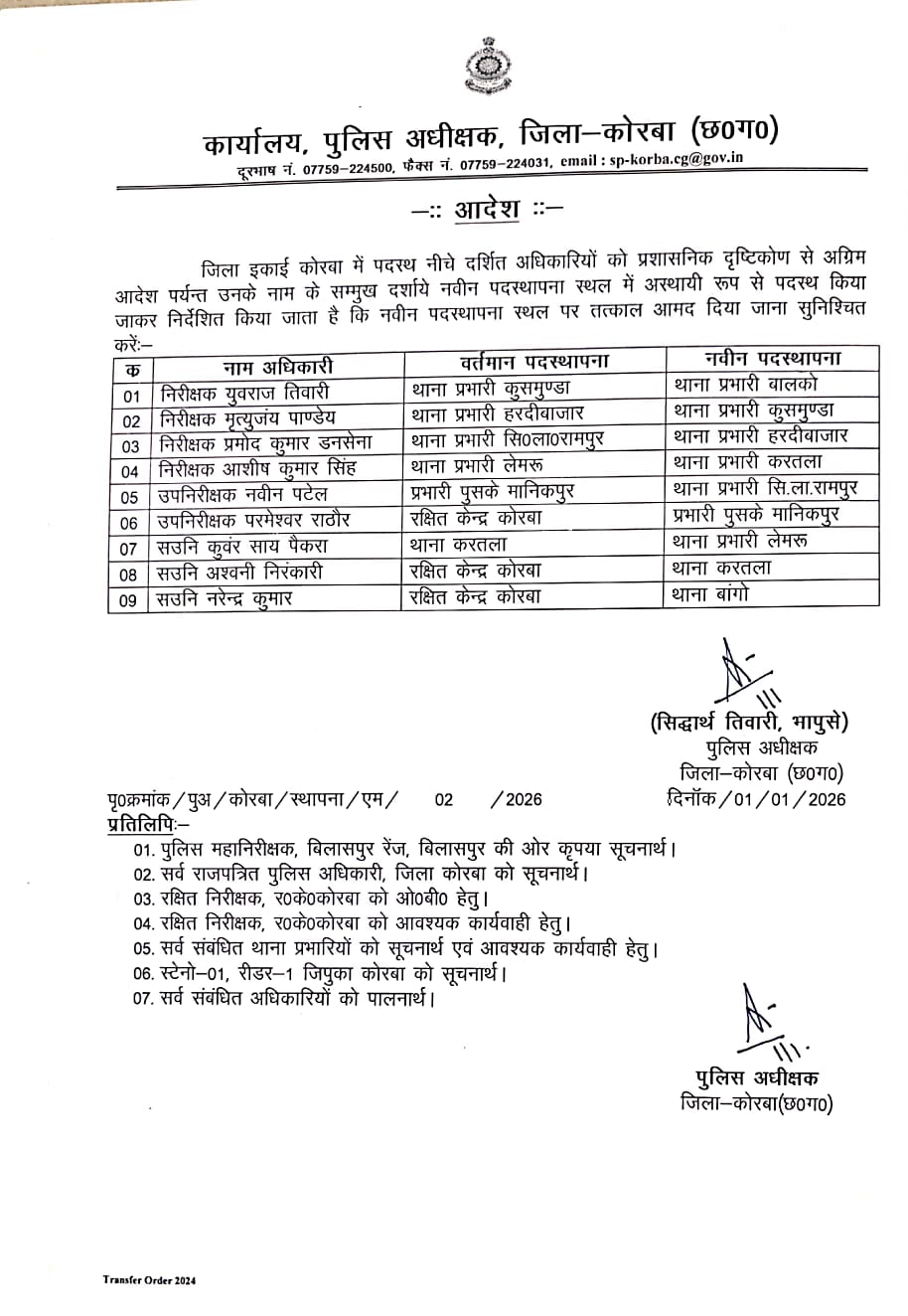 कोरबा: एसपी सिद्धार्थ तिवारी ने नए साल के पहले दिन पुलिस विभाग में बड़ा फेरबदल किया है। उन्होंने 4 थाना प्रभारियों (टीआई) सहित कुल 9 पुलिस अधिकारियों का तबादला किया है।