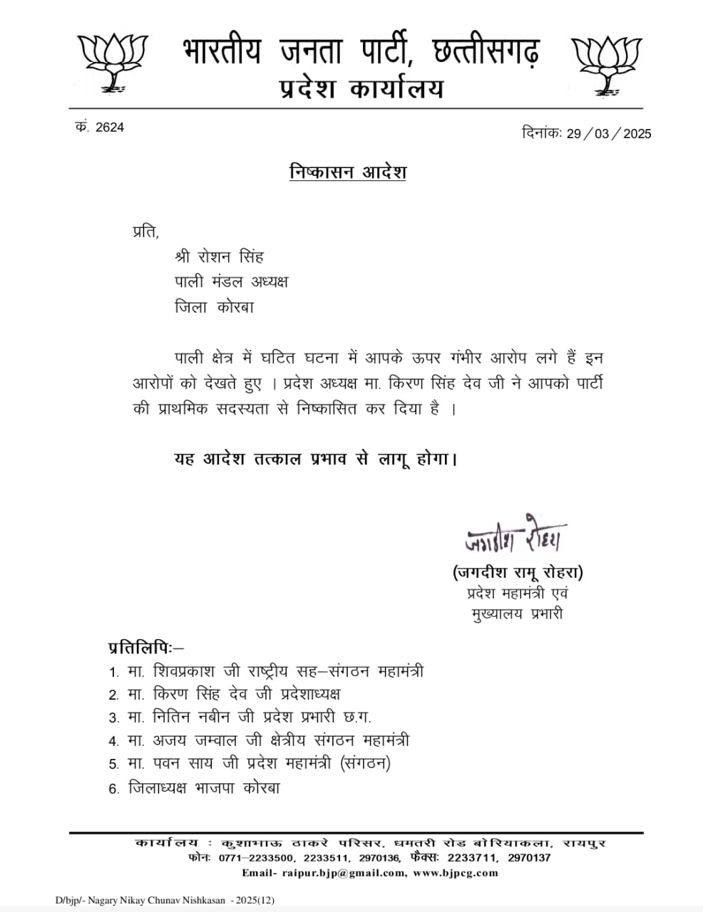 कोरबा (BCC NEWS 24): भारतीय जनता पार्टी, छत्तीसगढ़ प्रदेश इकाई ने पाली मंडल महामंत्री श्री विवेक कौशल को पार्टी से निष्कासित कर दिया है। प्रदेश अध्यक्ष मा. किरण सिंह देव के निर्देशानुसार यह कार्रवाई की गई। भाजपा प्रदेश कार्यालय से जारी आदेश में उल्लेख किया गया कि पाली क्षेत्र में घटी एक घटना में श्री कौशल पर गंभीर आरोप लगे हैं। इन आरोपों को ध्यान में रखते हुए प्रदेश अध्यक्ष ने उन्हें पार्टी की प्राथमिक सदस्यता से निष्कासित करने का निर्णय लिया। प्रदेश महामंत्री एवं मुख्यालय प्रभारी जगदीश राम रोहरा द्वारा हस्ताक्षरित आदेश में कहा गया है कि यह निर्णय तत्काल प्रभाव से लागू होगा।