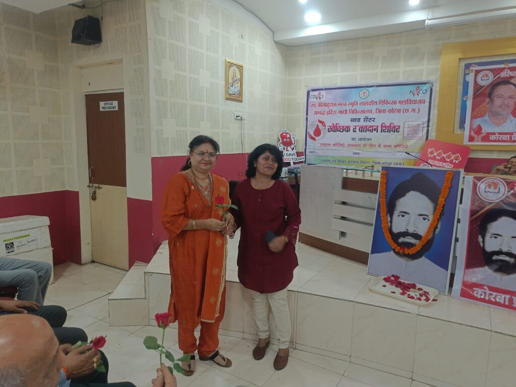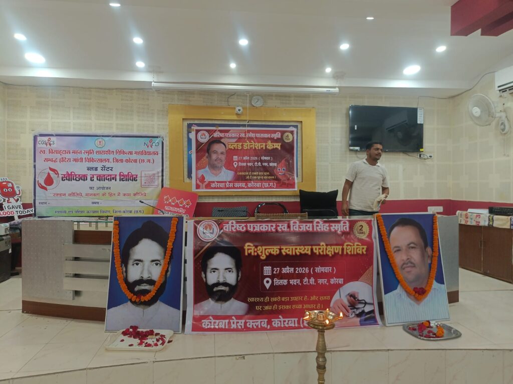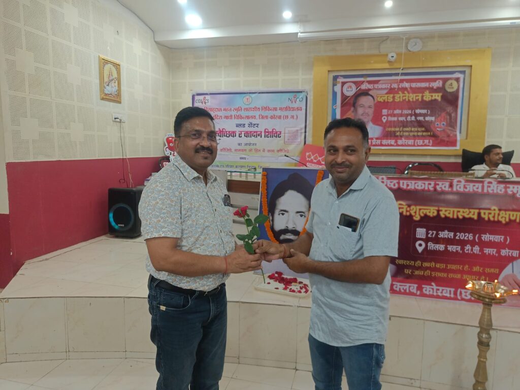 कोरबा (BCC NEWS 24): सेवा ही परमो धर्म के ध्येय वाक्य को चरितार्थ करते हुए कोरबा प्रेस क्लब द्वारा आज तिलक भवन, टी.पी. नगर में भव्य रक्तदान एवं निःशुल्क स्वास्थ्य परीक्षण शिविर का सफल आयोजन किया गया। यह आयोजन दिवंगत वरिष्ठ पत्रकार स्वर्गीय विजय सिंह और स्वर्गीय रमेश पासवान की पावन स्मृति में किया गया, जिसमें शहर के गणमान्य नागरिकों, पत्रकारों और उनके परिजनों ने बढ़-चढ़कर हिस्सा लिया। कार्यक्रम में प्रमुख अतिथियों के रूप में सीएमएचओ डॉ. एस. एन. केसरी, रेडक्रॉस सोसाइटी के चेयरमैन रामसिंह अग्रवाल, वाइस चेयरमैन राजेन्द्र तिवारी, चैंबर ऑफ कामर्स के अध्यक्ष योगेश जैन, महिला नेत्री अंजना सिंह, दीपक सिंह, एमजेएम हॉस्पिटल के संचालक डॉ. प्रिंस जैन, स्व. विजय सिंह जी की धर्मपत्नी श्रीमती मीना सिंह, उनके पुत्र सहायक जिला लोक अभियोजन अधिकारी अनिल सिंह, सुनील सिंह, स्व. रमेश पासवान जी के छोटे भाई रामप्रसाद पासवान व उनके पुत्र अनुप पासवान शामिल हुए।