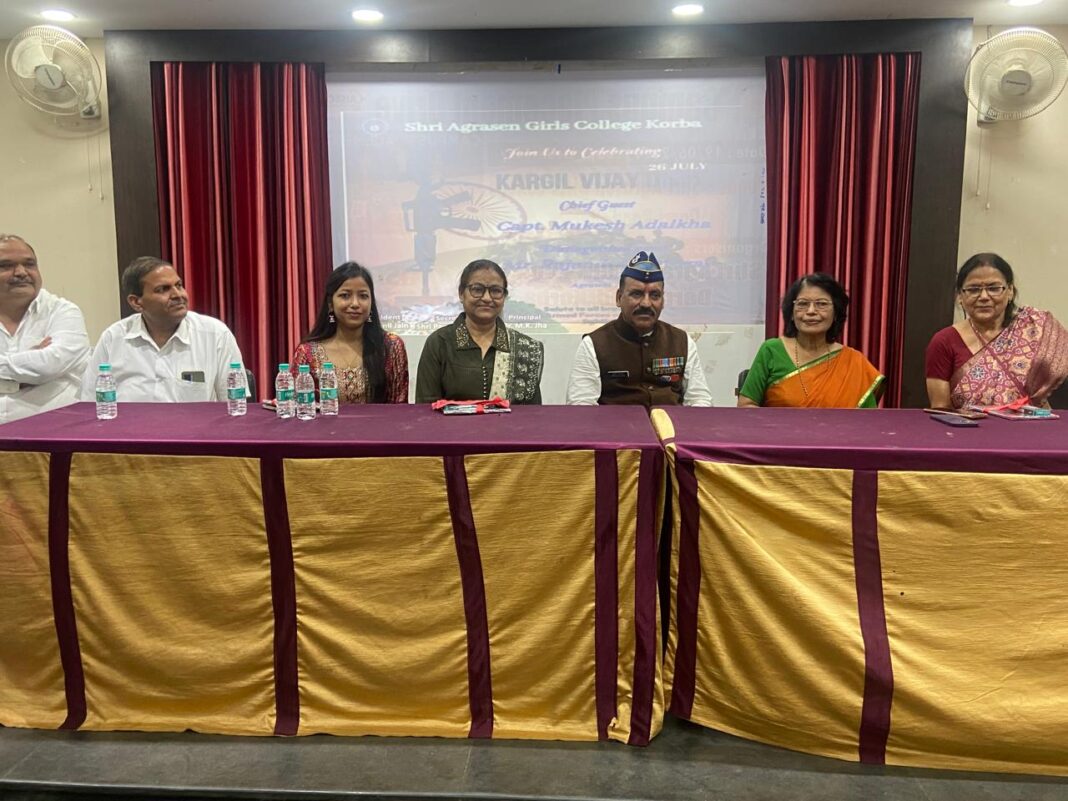 कोरबा (BCC NEWS 24): कारगिल विजय दिवस के अवसर पर श्री अग्रसेन कन्या महाविद्यालय में कार्यक्रम का आयोजन किया गया। कार्यक्रम में रिटायर्ड कैप्टन मुकेश अदलखा बतौर मुख्य अतिथि शामिल हुए। अपने संक्षिप्त उद्बोधन में उन्होंने वीर जवानों के पराक्रम और साहस का बखान किया। उनके द्वारा प्रतियोगिता के विजेताओं को पुरष्कृत भी किया गया। कोरबा शहर के ह्दय स्थल दर्री रोड स्थित श्री अग्रसेन कन्या महाविद्यालय में 26 जुलाई को छत्तीसगढ़ शासन के निर्देशानुसार कारगिल विजय दिवस पर कार्यक्रमों का आयोजन किया गया। इस दौरान छात्र-छात्राओं के लिए विभिन्न प्रतियोगिताओं का आयोजन भी किया गया। कार्यक्रम में मुख्य अतिथि के रूप में सेवानिवृत्त कैप्टन मुकेश अदलखा शामिल हुए। कार्यक्रम की अध्यक्षता अग्रवाल सभा के अध्यक्ष राजेंद्र अग्रवाल ने की। कार्यक्रम में विशिष्ट