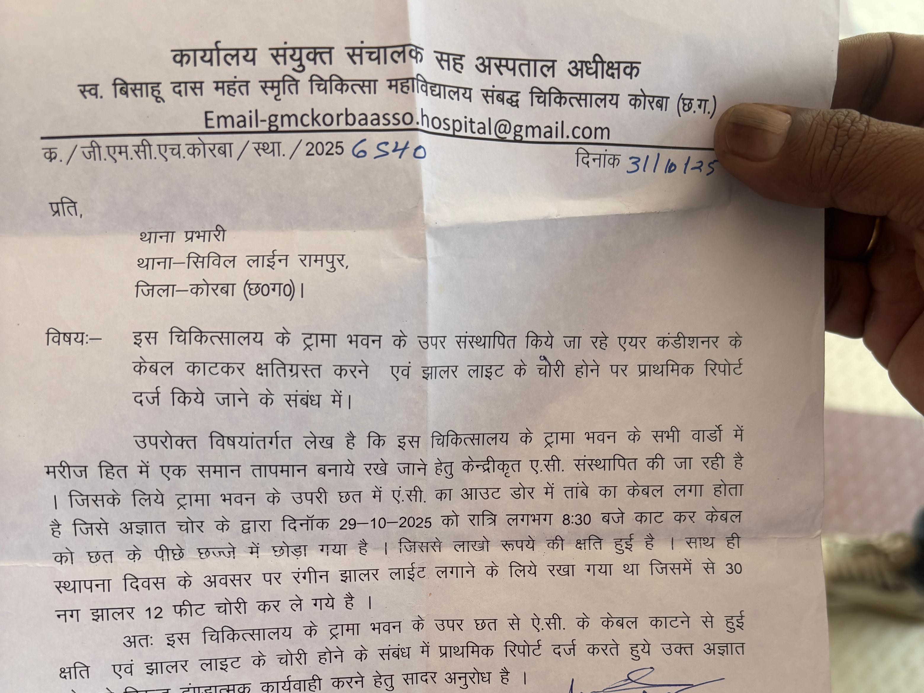 कोरबा: जिला मेडिकल कॉलेज अस्पताल में पिछले 20 दिनों में तीसरी बार चोरी की वारदात को अंजाम दिया गया है। ट्रॉमा सेंटर में लगाए जा रहे एयर कंडीशनर के आउटलेट, कॉपर पाइप और तार चुराए गए हैं। इसके अलावा वायरोलॉजी विभाग के एसी का आउटलेट भी गायब हैं।