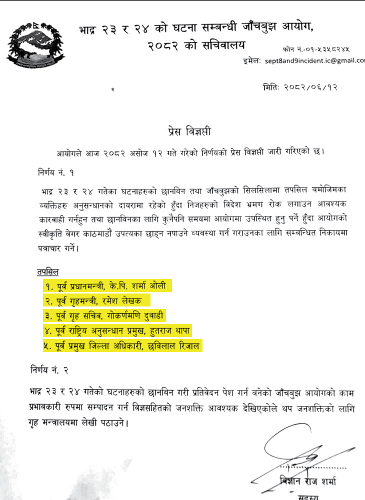 इसके अलावा आयोग ने इन नेताओं के पासपोर्ट निलंबित करने और कड़ी निगरानी रखने का भी आदेश दिया है। आयोग ने साफ किया कि बिना आयोग की अनुमति के कोई भी व्यक्ति काठमांडू से बाहर नहीं जा सकता।