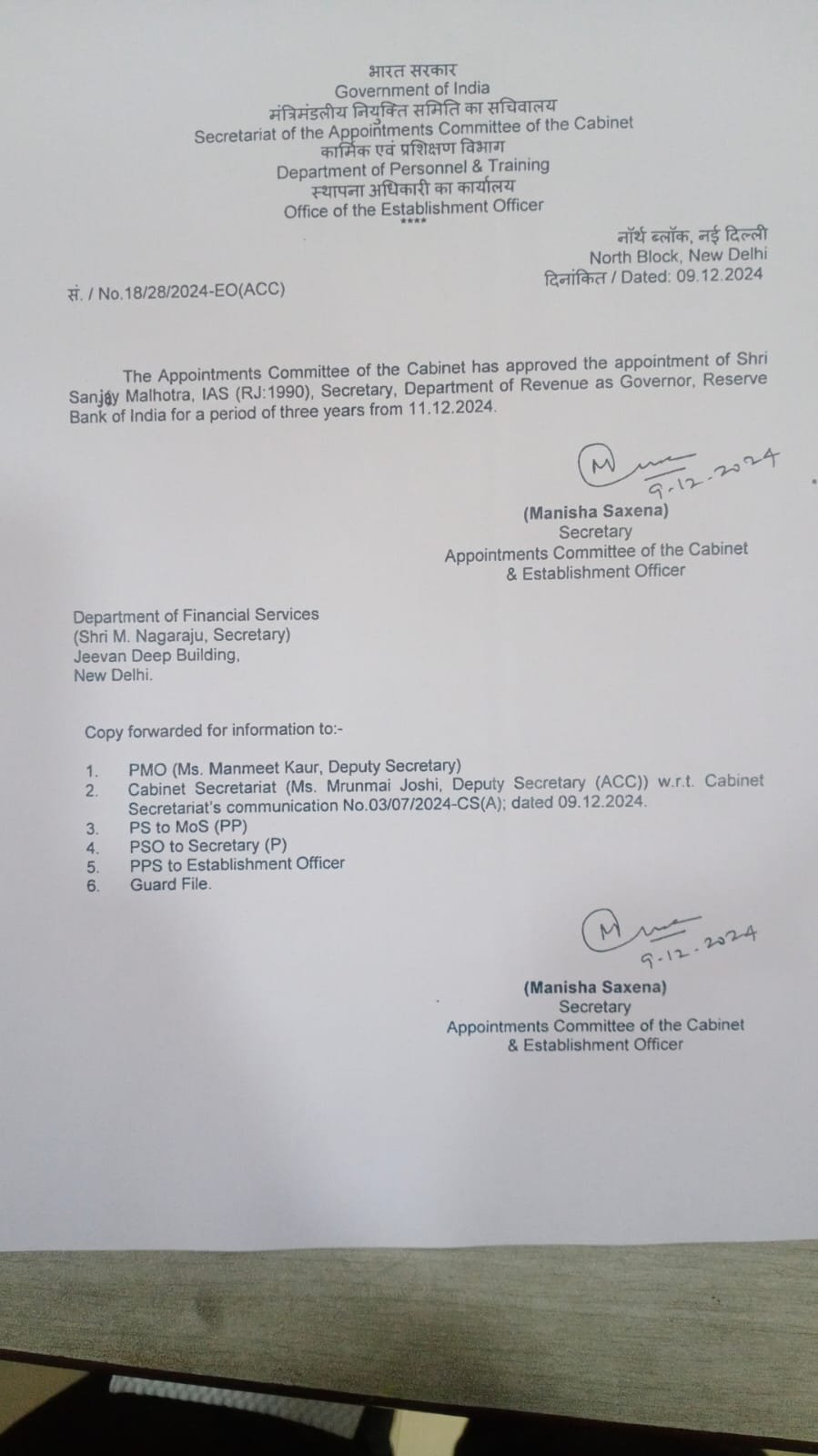 दास का 10 दिसंबर 2024 को कार्यकाल पूरा हो रहा है। 11 दिसंबर से मल्होत्रा गवर्नर का पद संभालेंगे। कैबिनेट ने आज 9 दिसंबर को संजय मल्होत्रा के अपॉइंटमेंट को मंजूरी दी है।