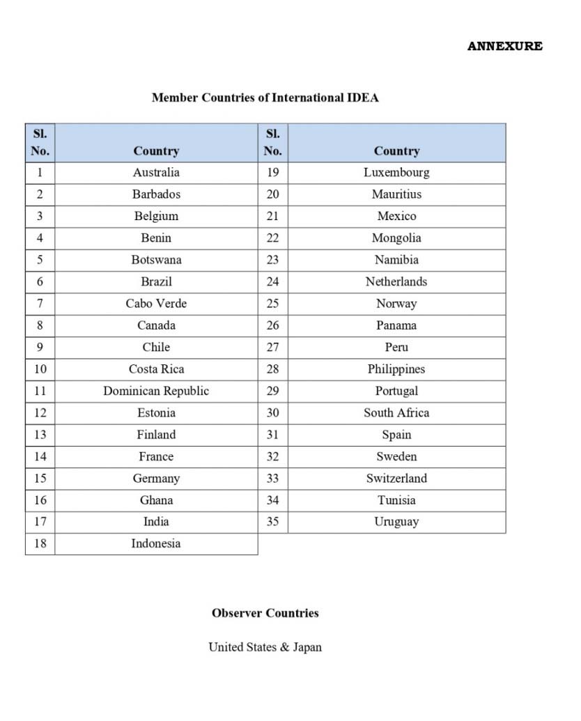 3. अंतर्राष्ट्रीय IDEA, जिसकी स्थापना 1995 में हुई थी, एक अंतर-सरकारी संगठन है जो दुनिया भर में लोकतांत्रिक संस्थानों और प्रक्रियाओं को मजबूत करने के लिए प्रतिबद्ध है। वर्तमान में 35 देशों की सदस्यता और संयुक्त राज्य अमेरिका और जापान के पर्यवेक्षक (Observers) के रूप में, यह संगठन समावेशी, सुदृढ़ और जवाबदेह लोकतंत्रों को बढ़ावा देता है (सदस्य देशों की सूची अनुबंध में है)।