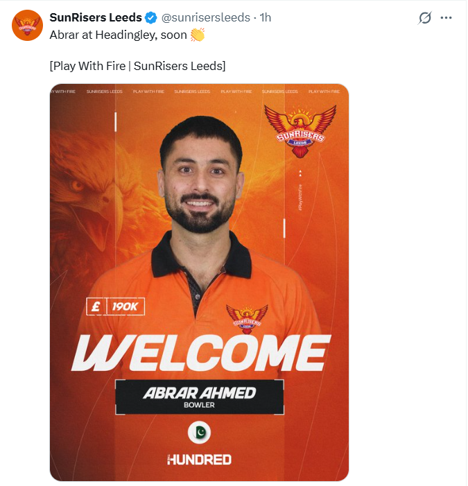 लंदन: भारतीय मालिकाना हक वाली फ्रेंचाइजी सनराइजर्स लीड्स ने गुरुवार को पाकिस्तान के मिस्ट्री स्पिनर अबरार अहमद पर बोली लगाई। सनराइजर्स की CEO काव्या मारन ने खुद उन्हें 1.90 लाख पाउंड (करीब 2.34 करोड़ रुपए) में खरीदा। इसी के साथ अबरार 21 जुलाई से शुरू हो रही द हंड्रेड लीग में किसी भारतीय मालिकाना हक वाली फ्रेंचाइजी से जुड़ने वाले पहले पाकिस्तानी खिलाड़ी बन गए।