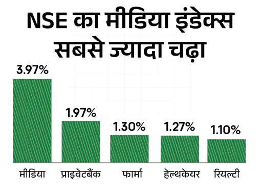 निफ्टी के 50 में से 37 शेयरों में तेजी रही। NSE का मीडिया इंडेक्स 3.97%, प्राइवेट बैंक 1.97%, फार्मा 1.30%, हेल्थकेयर 1.27% और रियल्टी 1.10% चढ़े। अकेला सरकारी बैंकों का इंडेक्स 0.37% गिरकर बंद हुआ।