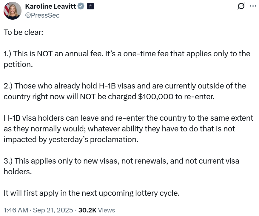 वॉशिंगटन डीसी: व्हाइट हाउस की प्रेस सेक्रेटरी कैरोलिन लेविट ने रविवार को सोशल मीडिया X पर को H-1B वीजा से जुड़ी कई जानकारियां दीं। उन्होंने बताया कि 88 लाख रुपए फीस सालाना नहीं लगेगी। यह वन टाइम फीस है, जो सिर्फ एप्लिकेशन देते समय लगेगी।